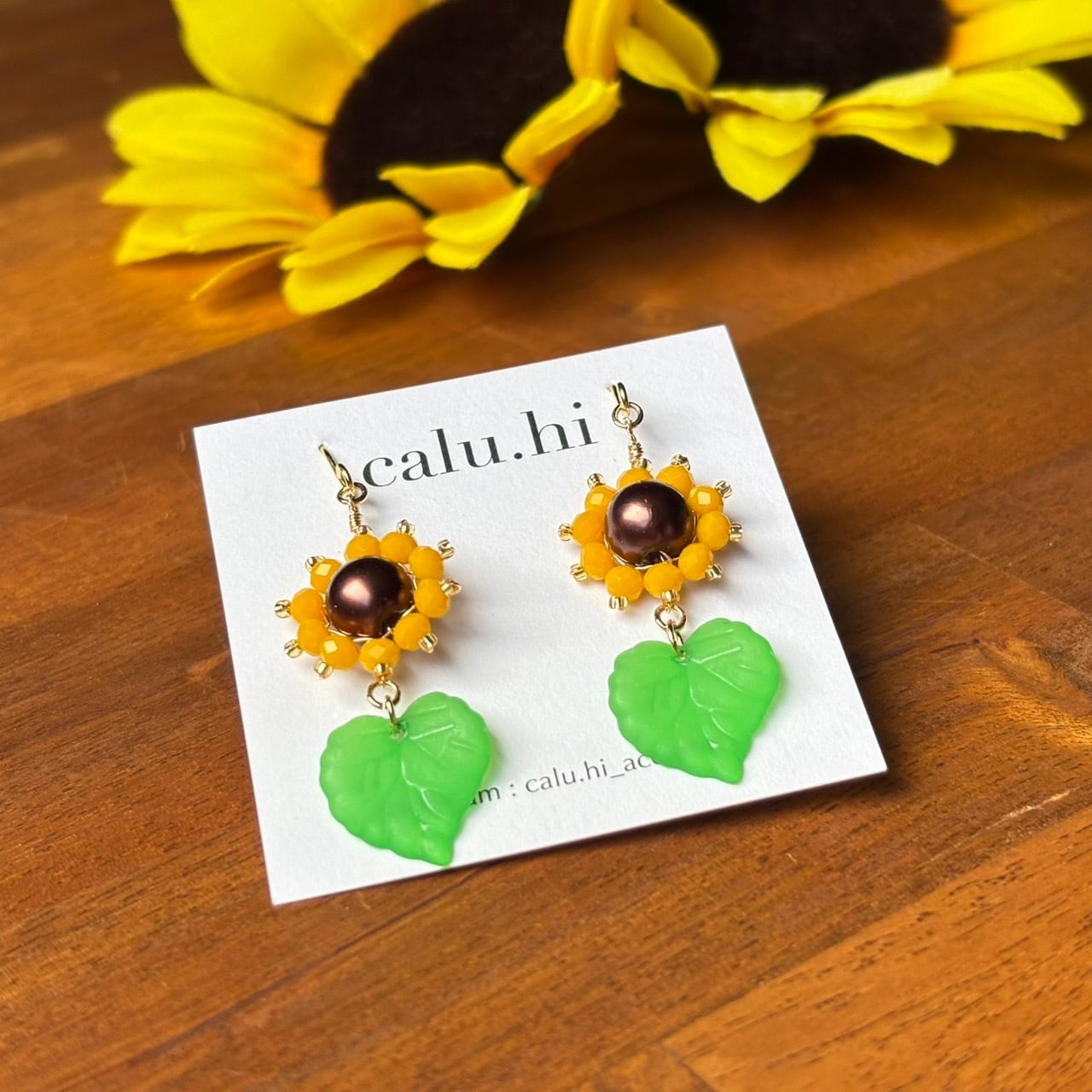 向日葵の名所 “幸手市権現堂“ の向日葵をイメージしたピアスとイヤリングです。
